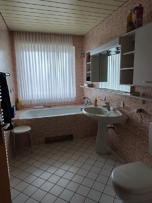 Aus der Diele gelangen Sie auch in den separaten Schlaftrakt, der aus 3 Schlafzimmern, einem bereits modernisierten Gäste WC mit großer Dusche und einem weiteren Badezimmer besteht. Aktuell sind braune Kunststofffenster mit Isolierverglasung verbaut. Die Fußböden variieren von Teppichböden und Fliesen, wobei im Keller Fliesenböden sich mit PVC-Böden abwechseln.