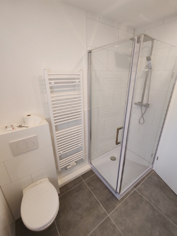 Die helle Erdgeschosswohnung verfügt über ein großes Wohnzimmer, ein Schlaf- und ein Kinderzimmer, ein Duschbad und eine Küche. Die Fußböden der Wohn- und Schlafräume sind mit hochwertigen Vinylböden in Holzoptik ausgestattet. Ferner verfügen diese Räume über Außenrolläden. Die Küche, der Flur sowie das Badezimmer sind mit modernen Fliesen ausgestattet. Alle Wände sind mit Raufastertapete tapeziert und weiß gestrichen. Im Flur sorgen Einbauspots in der abgehängten Decke für eine ideale Ausleuchtung. Das Badezimmer verfügt über eine Dusche und einen Handtuchheizkörper. Der Waschmaschinenanschluss befindet sich ebenfalls im Badezimmer. Auch hier wurden Einbauspots verbaut. Vom Wohnzimmer gelangt man auf die große, süd-westlich ausgerichtete Terrasse. Ein Keller und ein PKW-Stellplatz sind der Wohnung zugeordnet.