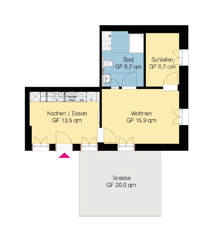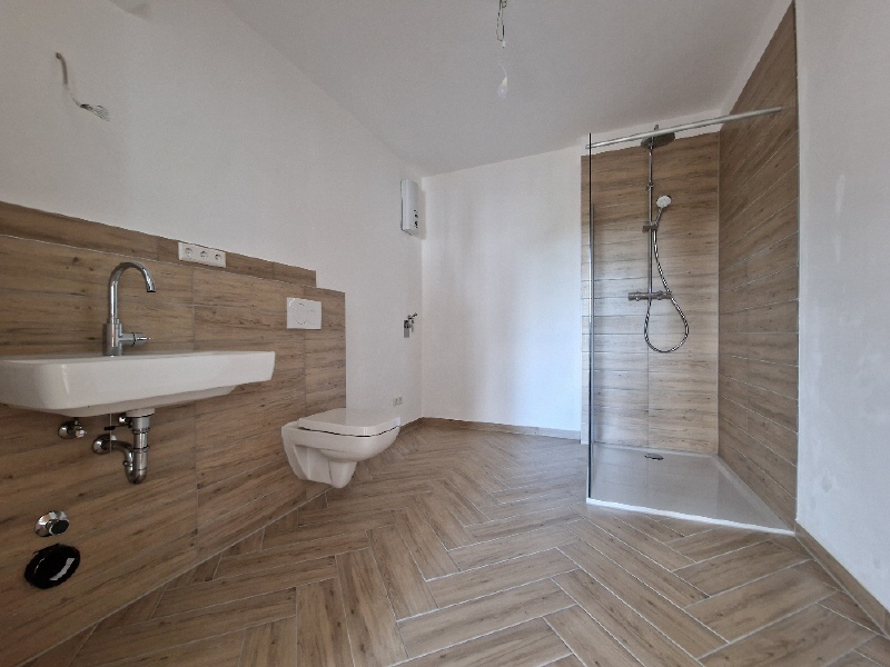 Die Wohnung verfügt über einen Wohn- Essbereich, der direkt über den Eingang zu erreichen ist. Dank der modernen Einbauküche kann direkt nach Einzug mit dem Kochen oder dem gemütlichen Beisammensitzen begonnen werden. Ferner sorgen Photovoltaikmodule zur Deckung des eigenen Strombedarfs für eine gute Energieeffizienz. Dank moderner Technik lassen sich der Heizungs- und Stromverbrauch App-basiert steuern. In allen Wohn- und Schlafräumen wurden hochwertige Fliesen verlegt. Die darunter befindliche Fußbodenheizung sorgt in den kalten Monaten für wohlige Wärme. Das Badezimmer verfügt über eine Dusche sowie Platz für Ihre Waschmaschine. Neben dem Eingang befindet sich eine ca. 20 m² große Terasse, die nach Ihren persönlichen Vorlieben gestaltet werden kann.