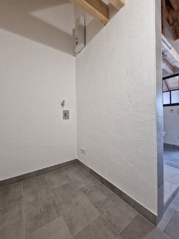 Das Badezimmer ist mit einer modernen Dusche ausgestattet. Der Bereich hinter der Duschwand steht für die Waschmaschine sowie einen Trockner bereit und bietet zusätzlich etwas Stauraum für Ihre Utensilien.