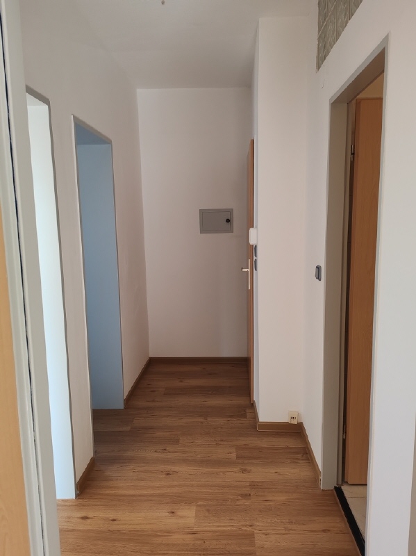 Die Wohnung ist in weiß gestrichen und erhielt neue Bodenbeläge in den Wohnräumen sowie im Flur. Die Fenster sind alle mit wärmegedämmten Aussenjalousinen versehen. Vom Wohnzimmer gelangen Sie auf den Balkon mit Blick auf die Felder und Natur. Die Küche ist gefliest und mit einer neuen Einbauküche mit E-Herd und Backofen (ohne Geschirrspüler/ Kühlschrank) ausgestattet. Das innenliegende Duschbad erhielt neue Sanitärobjekte.