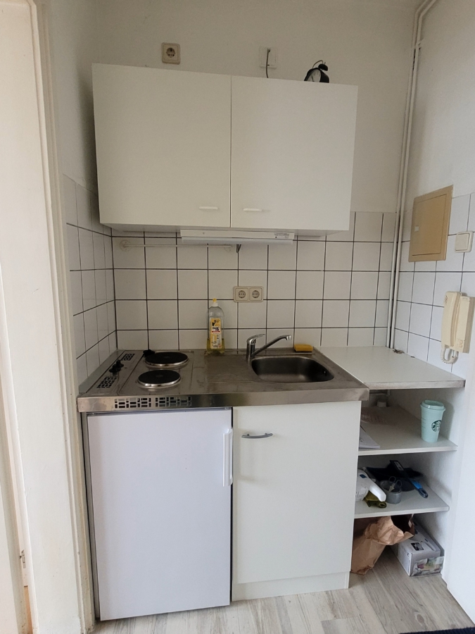 Das ca. 12 m² große Zimmer ist mit Laminat ausgestattet. Im kleinen Flur befindet sich ein Pantry-Küche mit einfacher Spüle, 2-Platten-Kochfeld und Kühlschrank. Das kleine innenliegende Duschbad ist hell gefliest. Ein Kellerraum ist der Wohnung zugehörig.