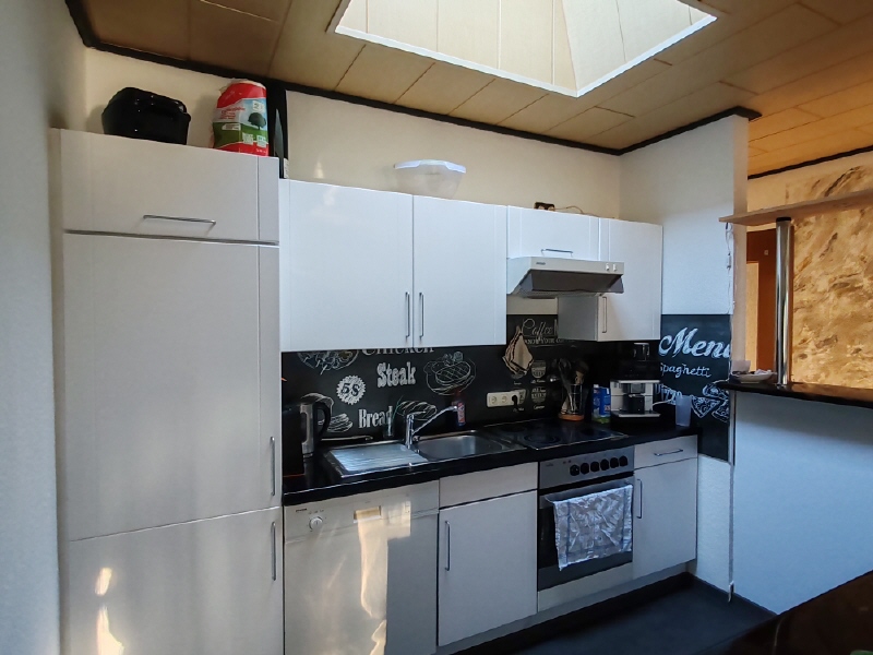 Die Schlafräume sowie der Flur sind mit Laminatboden versehen, das Wohnzimmer und die Küche sind gefliest und mit einer Einbauküche mit E-Geräten ausgestattet. Alle Wände sind weiß gestrichen., Die Decken sind holzvertäfelt, in den Schlafräumen wurden sie noch hell gestrichen. Das Duschbad ist in modernen Tönen (grau und weiß) gefliest. Die Waschmaschine findet hier ebenfalls ihren Platz. Durch das Oberlicht gelangt viel Tageslicht in das Bad.