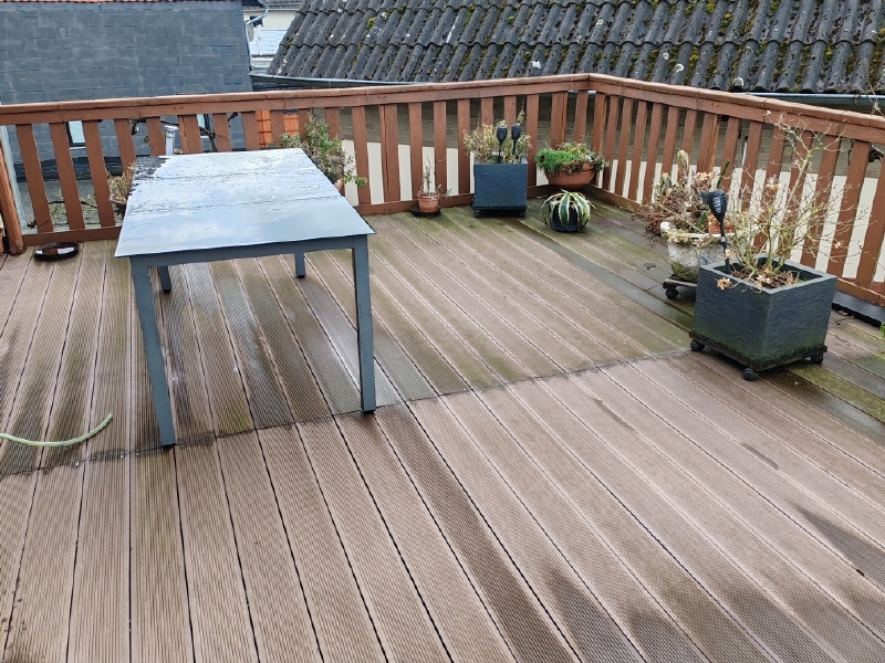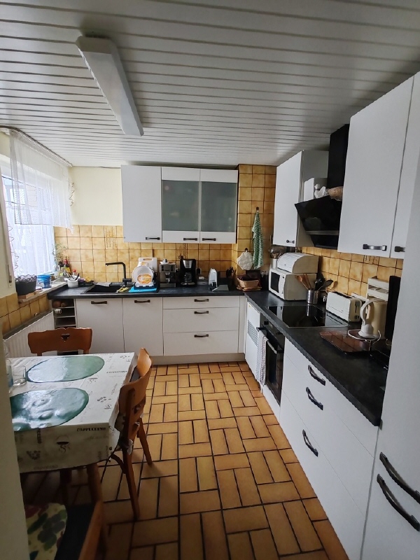 Im Obergeschoss entstand ein modernes und komplett neues Badezimmer mit großzügiger Dusche. Eine moderne Einbauküche mit weißen Fronten verbleibt in der Wohnung. Als Küchenfußboden wurden Fliesen in Holzoptik gewählt.