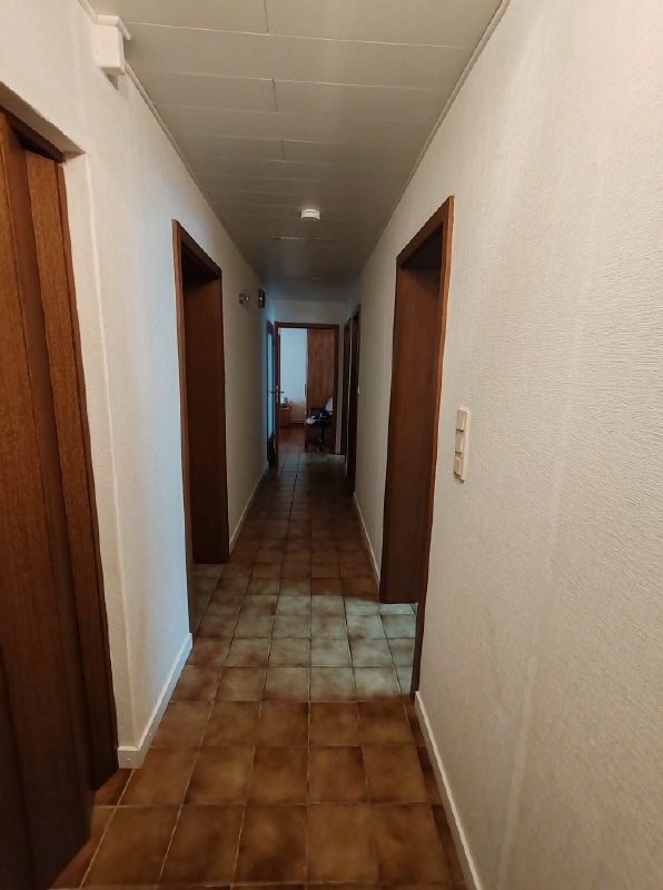 Hinter der Wohnungstür im Erdgeschoss öffnet sich ein in L-Form gestalteter Flur, der alle Räume erschließt. Der Fußboden ist gefliest und an die braunen Türen und Zargen angepasst. Die Decke ist mit Holzpaneele abgehangen. Die Küche im Erdgeschoss wird bei Auszug mitgenommen.
