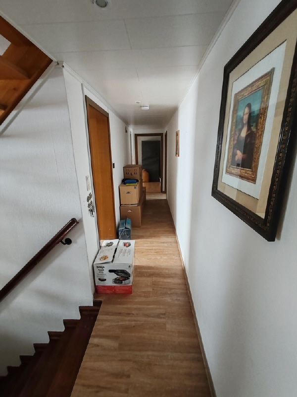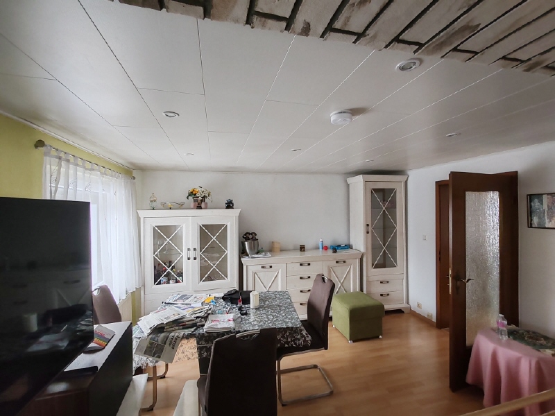 Der Flur im Obergeschoss hat einen Fliesenbelag, sowie braune Türen und Zargen zu den einzelnen Räumen. Der Wohnraum verfügt über einen Laminatboden in Holzoptik und eine weiß abgehängte Paneeldecke mit Einbauspots. Auf dem Dach der Garage entstand eine ca 20 m² große Dachterrasse. Im dazugehörigen Spitzboden befindet sich eine Hobbywerkstatt und viel Stauraum.