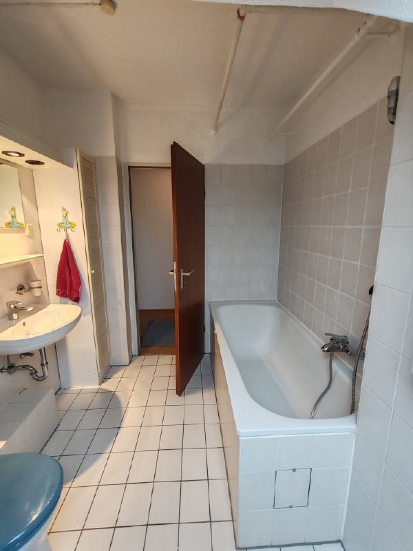 Das großzügige Wohnzimmer mit Essbereich verfügt hier über 2 Loggien. Der Fußboden besteht aus einem älteren Laminat wie auch im Flur. Das Schlafzimmer ist mit Teppich ausgelegt. Das hell geflieste Badezimmer verfügt über eine Badewanne, WC und Waschbecken. Hier findet auch die Waschmaschine ihren Platz. In der Küche befindet sich eine ebenfalls älteren Einbauküche sowie ein dunkelgrauer PVC-Belag.